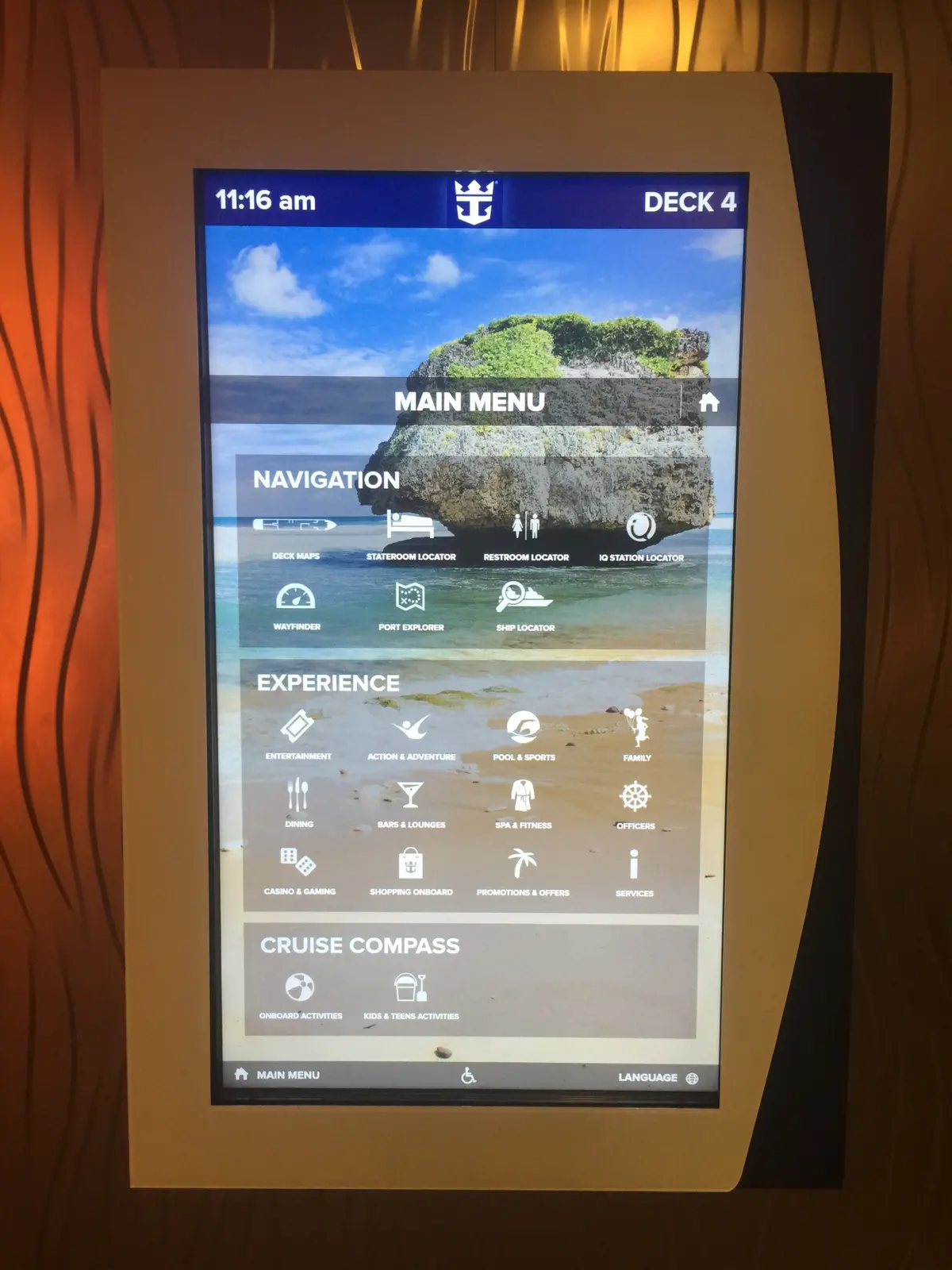 On every new and refurbished Royal Caribbean cruise ship over the last decade or more, there are large screens at every elevator lobby where guests can view activities, get directions to a particular venue, and other features.