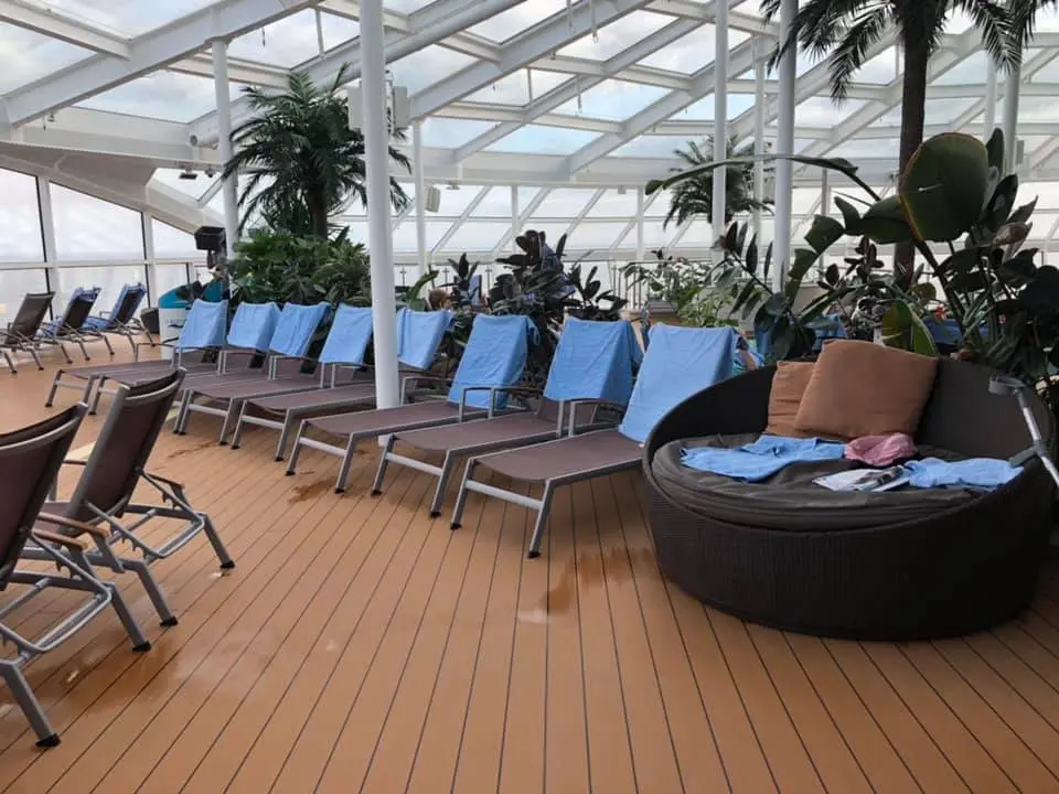 Some ships have a totally glass-enclosed Solarium area, while other ships are open-air. The glass keeps the heat in, and often, the Solarium is one of the warmest spots onboard.