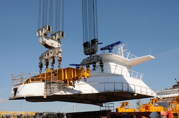Harmony of the Seas, Royal Caribbean's third Oasis class cruise ship, reached another construction milestone, with the installation of her last block at the shipyard in STX France.