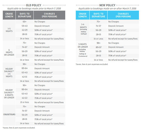 In a nutshell, the penalty schedule has been reduced from four unique schedules to now two penalty periods. In addition, for sailings 5-nights or longer, the cancellation period has been moved up from 75 days prior-to-sailing to 90 days prior-to-sailing.