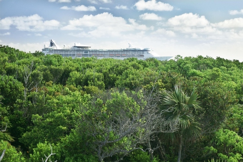 Next, is a photo of Enchantment of the Seas by Christopher Simone. This photo was taken on Coco Cay, when Christopher and his family took a walk to a point toward the far east end of Barefoot Beach. They found a pile of sand nearly 20 feet high, which got them a great view of the ocean and Enchantment of the Seas apparently plowing through the lush foliage of the inner island toward the north.