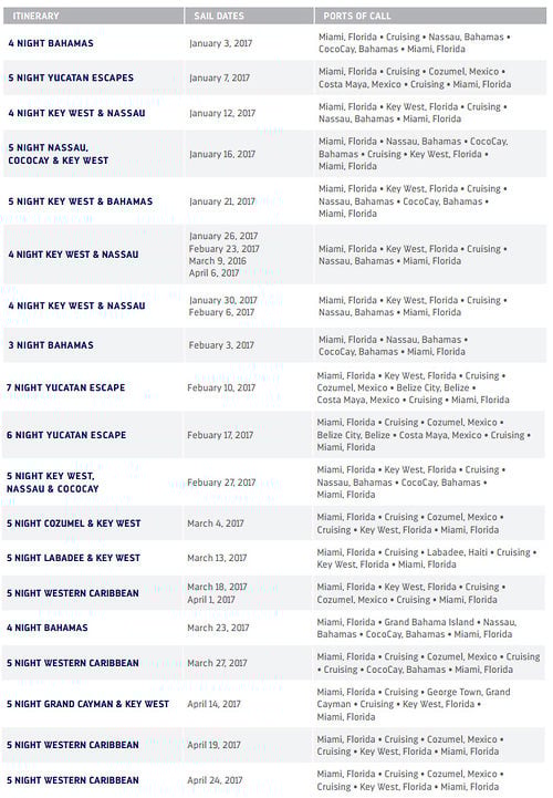 The new sailings are a variety of 3, 4, 5, 6 and 7-night cruises to destinations in the Bahamas, Key West, Belize, Mexico and Grand Cayman.
