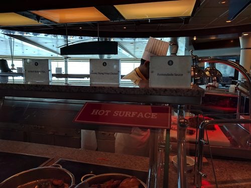 Once onboard we headed right to the Windjammer for lunch. It was reasonably empty since we were among the first to board, and had a reasonable selection, including a giant “Welcome” sheet cake (which I passed on in favor of other sweets). I had some chana masala (my favorite Indian dish), vegetable biryani, kidney bean and pineapple stew (new to me, but pretty awesome), and some random vegetables. Overall I was pleased with the selection. Somehow, I managed to not overeat, had only a small selection of desserts (your standards), grab an espresso and then take a walk as the Windjammer filled with the losers guests that showed up later than we did. Oh, for those who are so inclined, I did notice the much revered Honey Stung Chicken was there today! I don’t eat meat, but the sign looked delicious.