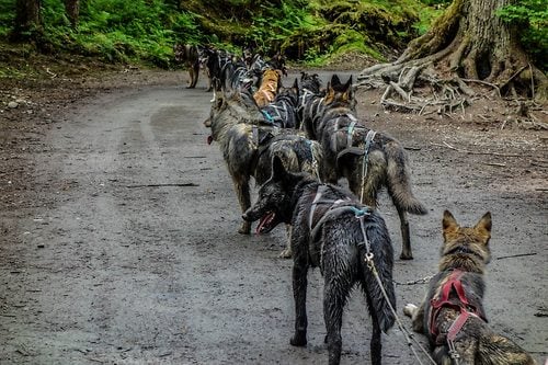 Contrary to popular belief, there is no snow in the ground in the summer in Alaska, so the dogs practice pulling a cart that is meant to evoke the same experience as a dog sled. A group of dogs pull the cart around a track that goes through a large portion of the forest.