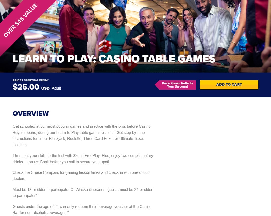 A new option on Royal Caribbean's Cruise Planner is called "Learn To Play: Casino Table Games", which costs $25 per adult and it includes $25 in FreePlay, plus two complimentary drinks.