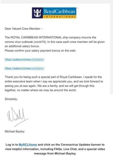 Furthermore, Mr. Bayley emphasized crew not to click the links, and that all information will be shared via the Royal Caribbean employee portal.