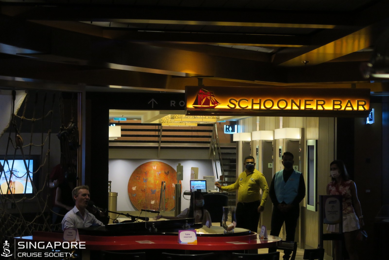 For entertainment for our last evening aboard, we relaxed at the famous Schooner Bar on deck five, where we were getting our last drink of the night before the bars closed at 10pm mandated under local regulations.