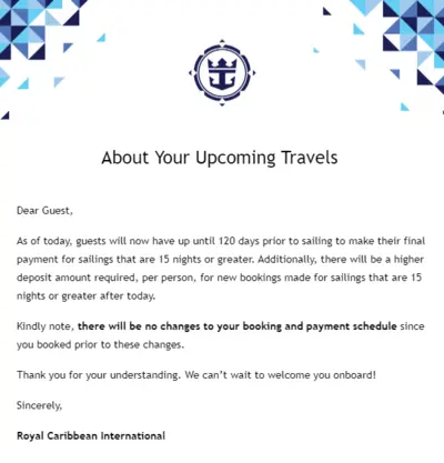 "As of today, guests will now have up until 120 days prior to sailing to make their final payment for sailings that are 15 nights or greater. Additionally, there will be a higher deposit amount required, per person, for new bookings made for sailings that are 15 nights or greater after today."