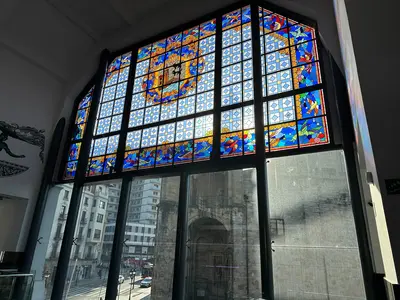 The building has stained glass windows, and an Art Deco motif to its exterior.