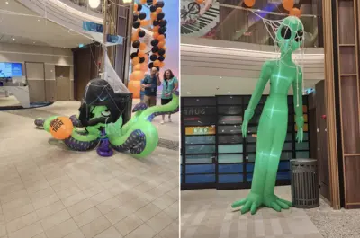 The Royal Promenade is decked out with inflatables, ranging from larger-than-life aliens to an octopus with a trick-or-treat bucket.