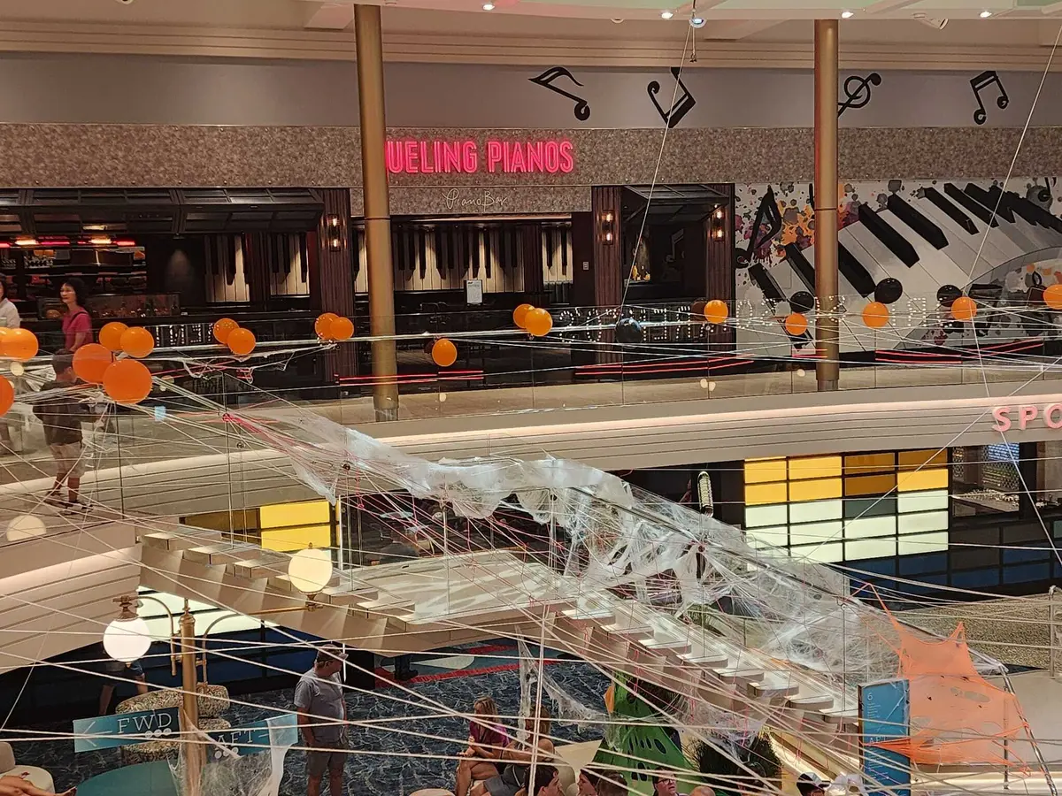 Spiderwebs lines the banister of the staircase leading up to Deck 6, with balloons in black and orange affixed to the railings overlooking the Promenade below.