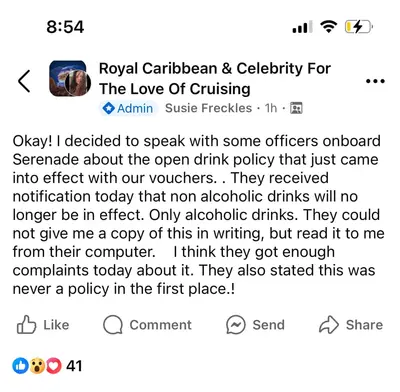 Debbie Vestal Reis wrote, "Apparently, corporate had a lot of complaints. They have changed to only alcoholic beverages. So, I suppose the only beverages would be beer and wine? The officer on her ship showed her to up to date email."