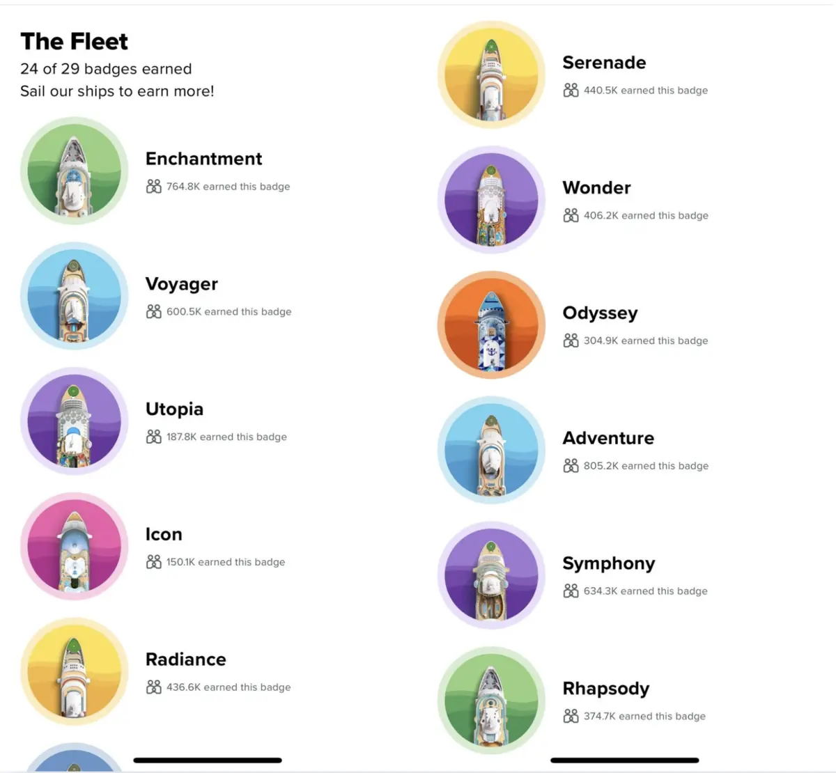 For example, if you have been on 10 of Royal Caribbean's 29 ships, it will read, "10 out of 29 badges earned" at the top of the screen, giving you a quick overview of your progress.
