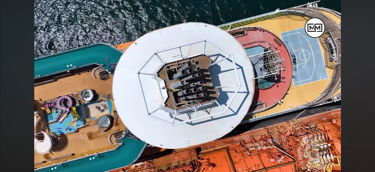 For instance, the once-pristine hull of the ship is now streaked with rust from bow to stern. The rust can be seen in nearly every angle of the drone video. In addition, the classic Royal Caribbean anchor can still be seen on the ship’s top deck, an ode to the vessel’s previous life.