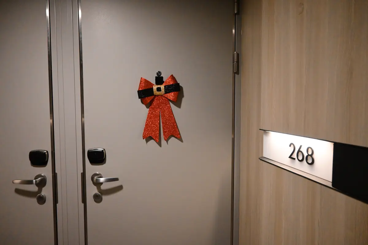 We loved having the big red Christmas bow on our door because it made our cabin easy to spot in the hallway. The glittery bow felt festive without being too much. I used a heavy-duty clip from Dollar Tree to hang it, and it stayed in place for all 12 nights without any issues.
