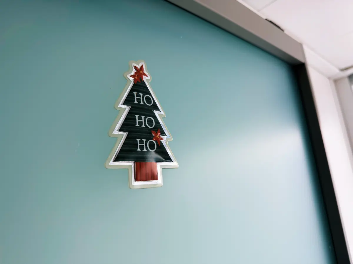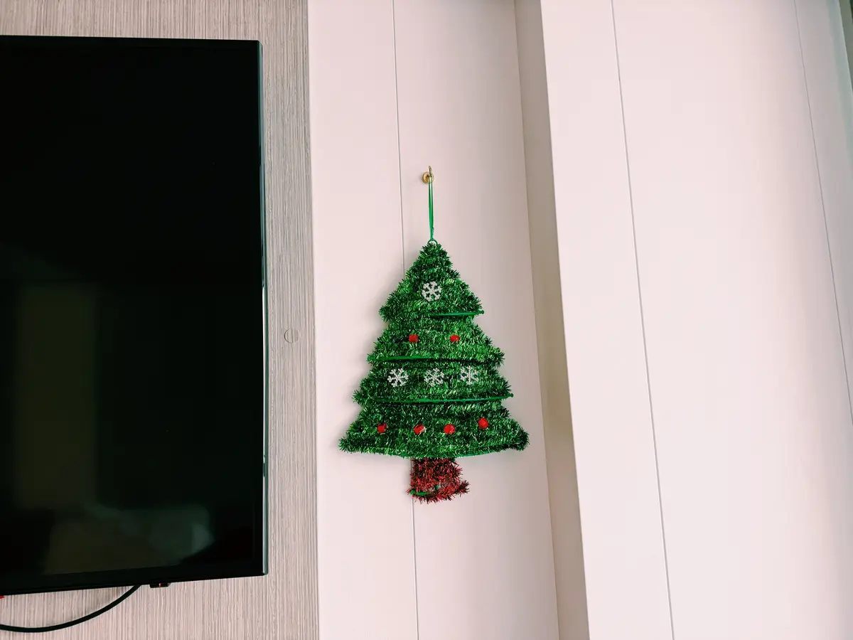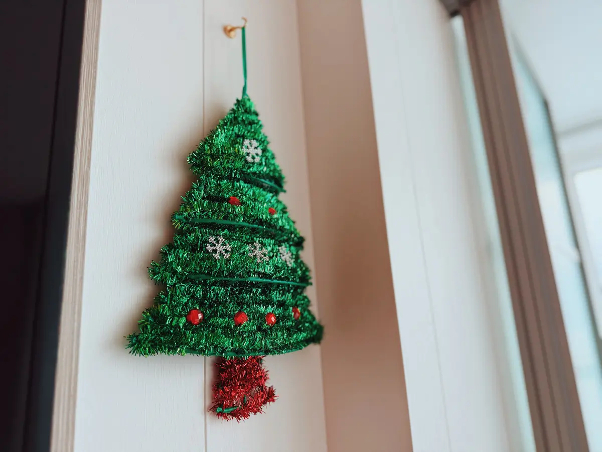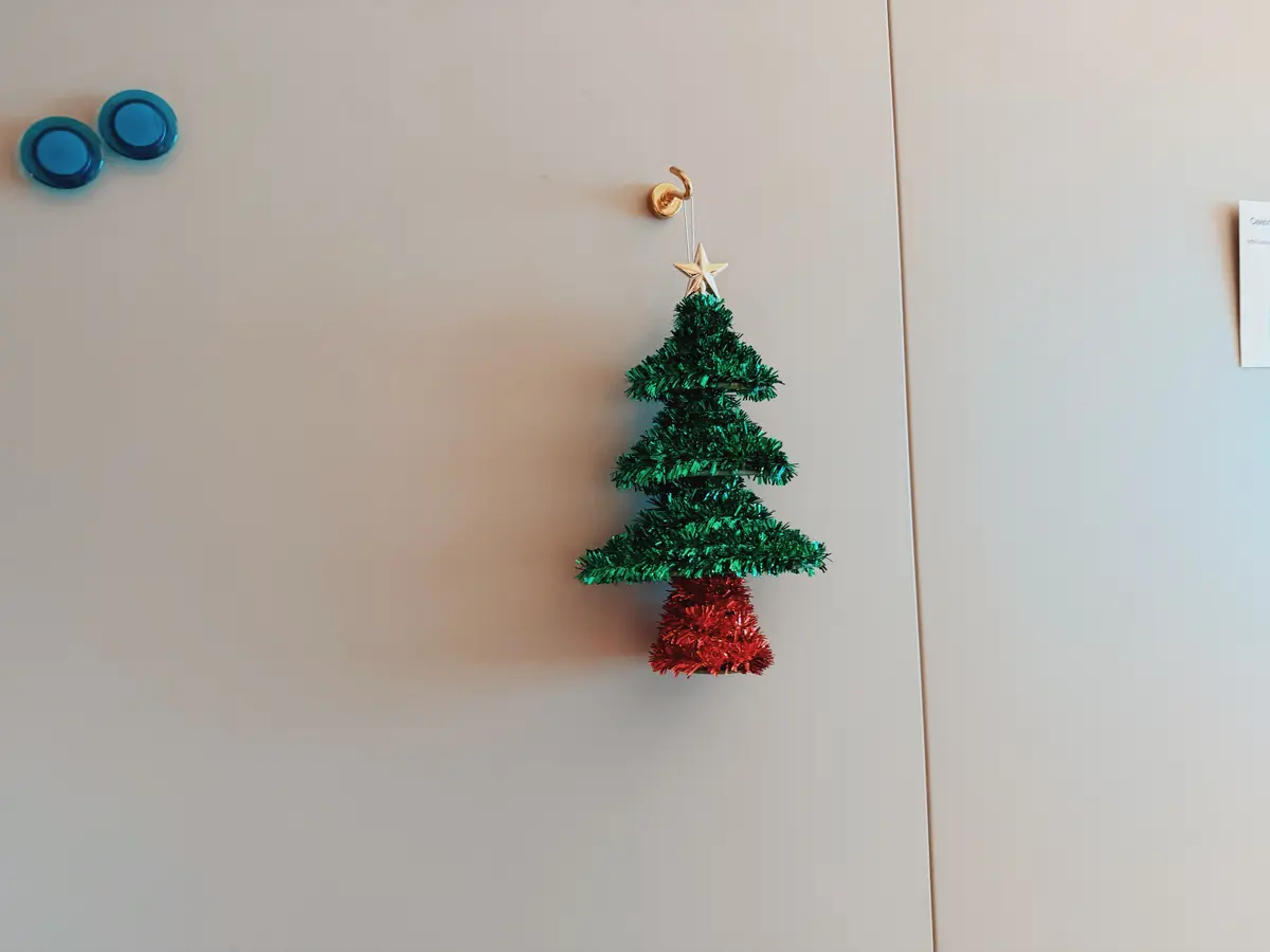 We added two more tinsel Christmas trees to the main wall of the cabin, hanging them with magnetic hooks. Because they were so lightweight, one hook per decoration was enough. If you plan to bring anything heavier, you’ll probably want stronger or extra hooks. I loved waking up each morning and seeing those little Christmas trees on the wall.