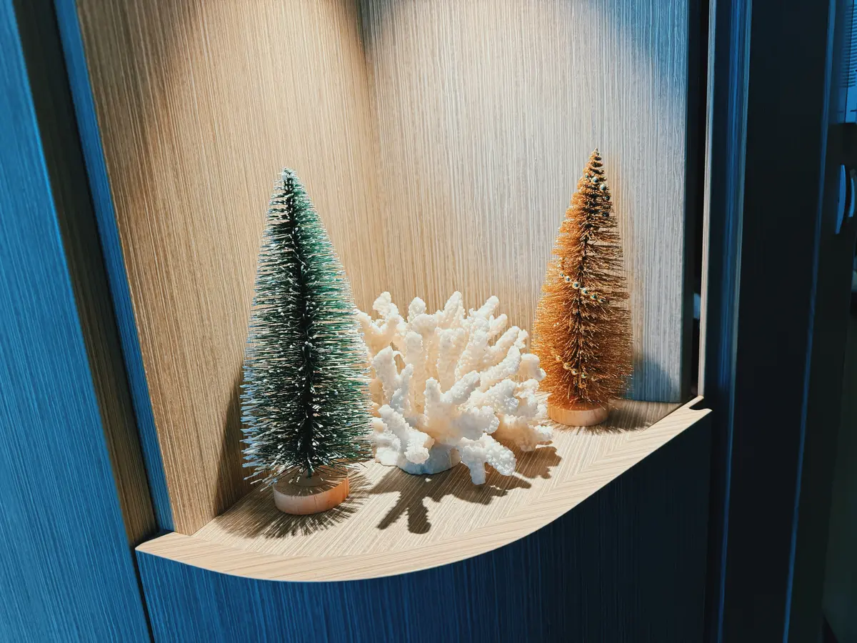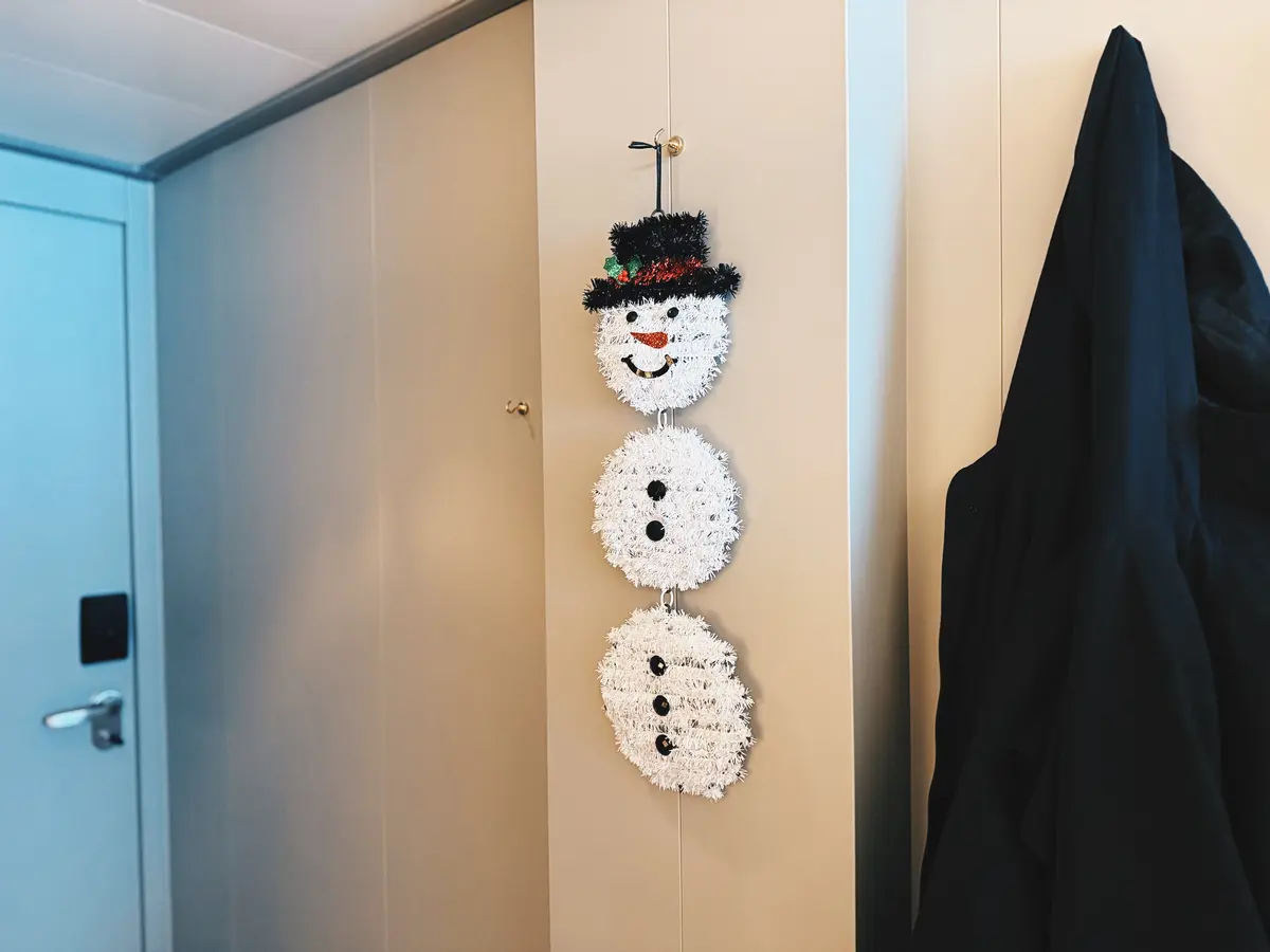 Inside the cabin, we placed a small snowman near the entrance, so we were greeted by him every time we came back. Across from it, Edge-class staterooms have a small cubby with a built-in light that usually holds a piece of decorative art. We swapped that out for two small Christmas trees that fit perfectly in the space. With the light above them, they added a nice little holiday touch.