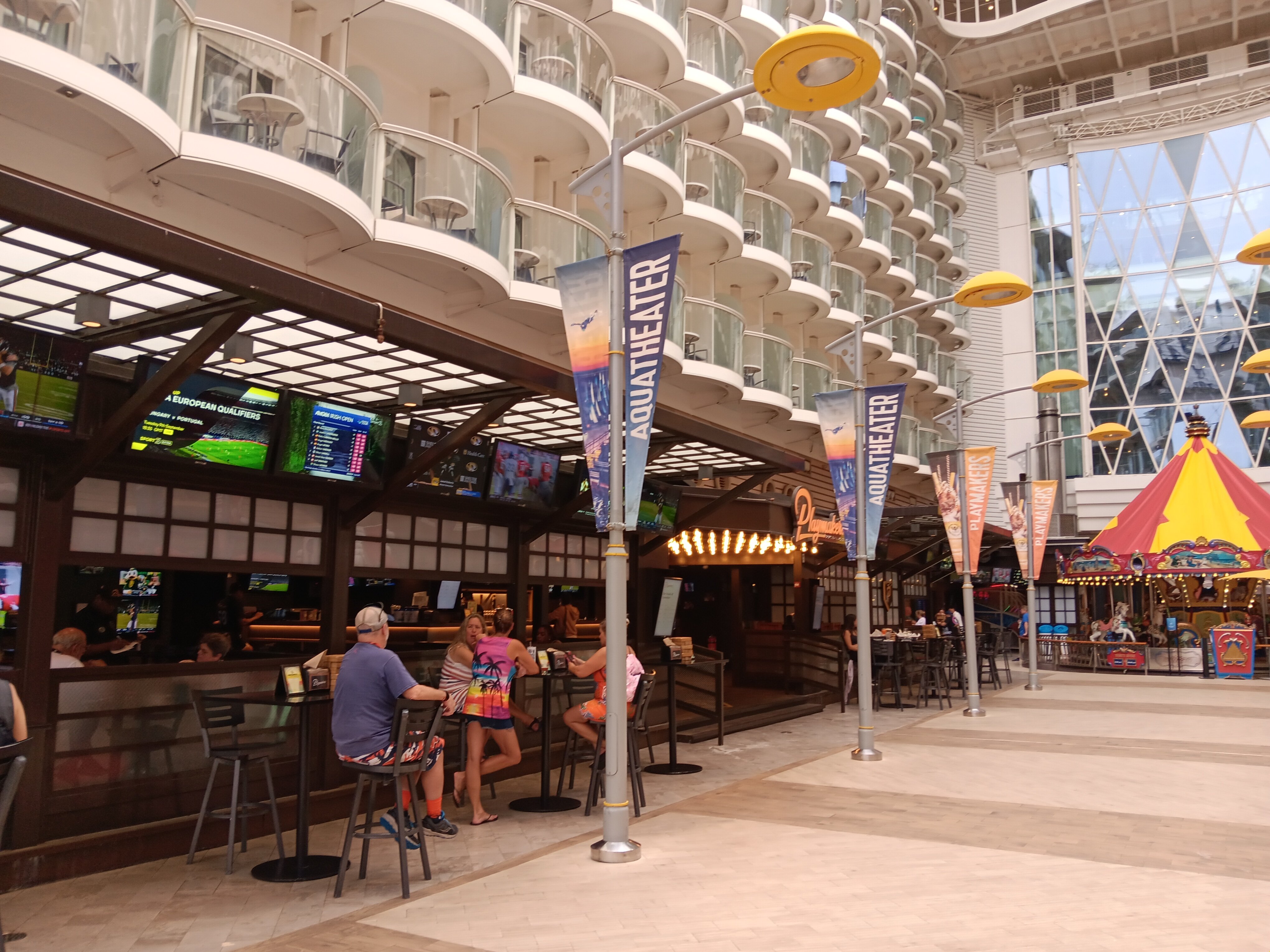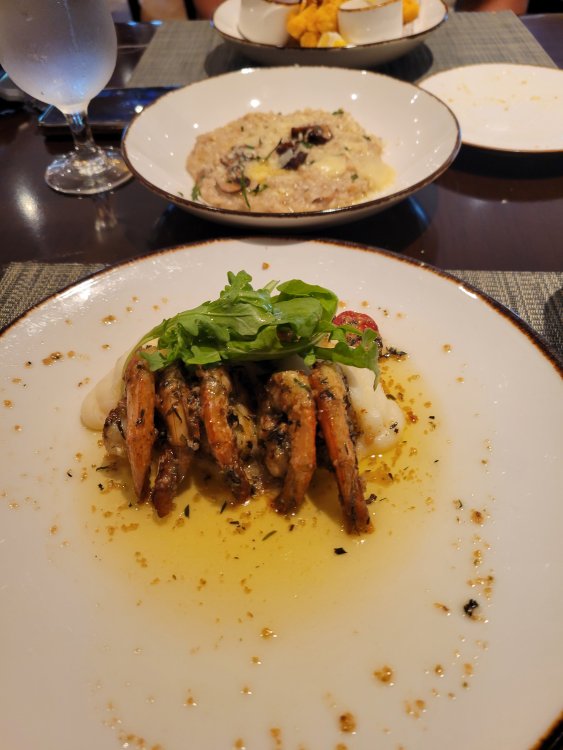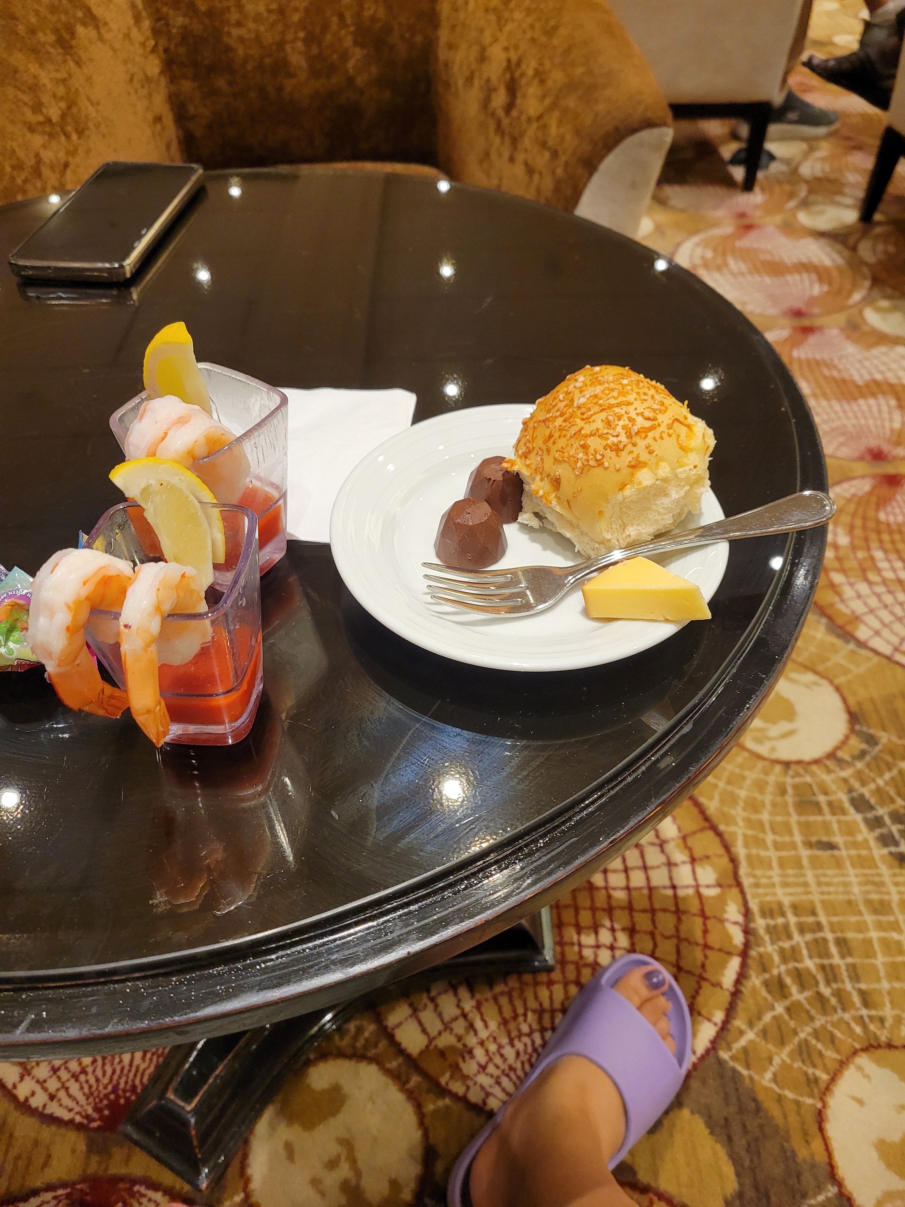 GT was popping and our waiter wasn't happy with us. He brought out only olive bread, i asked about regular and he said that's what the bakery sent. I told him I didn't eat olive, but okay. He made a big deal of bringing back regular and then had an attitude . We ate pretty light; my brother 3 apps and me with the wild mushroom risotto and prawns. The risotto was great but the prawns were just oregano shrimp. My brother ate them. Waiter asked why I ordered them if I didn't like oregano. I smiled through that tomfoolery and went back to the casino. I wouldn't even care about the crowds, I expect them on something like an Oasis class. it's the awareness. I used the elevator once and instead of allowing me and others to exit, they just push in. No excuse me etc. Also why would you not close the bathrooms door when you go???????? I need to write a book about cruise people. Also I'm going to tell another funny story. I got to the lounge around 4:45. The food was out behind a rope, this vintage climbed over it, saying loudly he has low blood sugar. Now at that time I ordered a peach daiquiri. I got a shrimp cocktail, some cheese, a roll and 2 hazelnut truffles when it opened at 5. I ate those and then was telling my brother casino stuff. We hear some raised voices. This guy is complaining, he ordered his drink at 5:05 and it's almost 5:30. Well I ordered before him and still don't have my drink either. In fact I was planning to leave but he has my card. At this point my snack combination isn't agreeing with me, so I need to go and tell they CL concierge to cancel my drink and give my card to my brother. He is trying to get me to take the drink but I don't want my stomach hurting more. Then the rest of the vintages realized they waited 30min for drinks and all hell breaks loose. I then went to the casino and watched a guy blow through $500 on $20/spins to finally get a bonus and get a handpay for $1743. Which he said just broke him even for the trip. Im still low rolling, I've already got my brother 400pts and me almost 400. We are having takeout. My brother ordered sushi from Izumi, smoked turkey and fries from Portside and I am getting a Playmakers burger.8 points