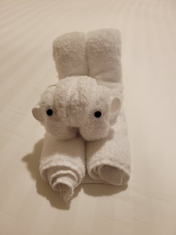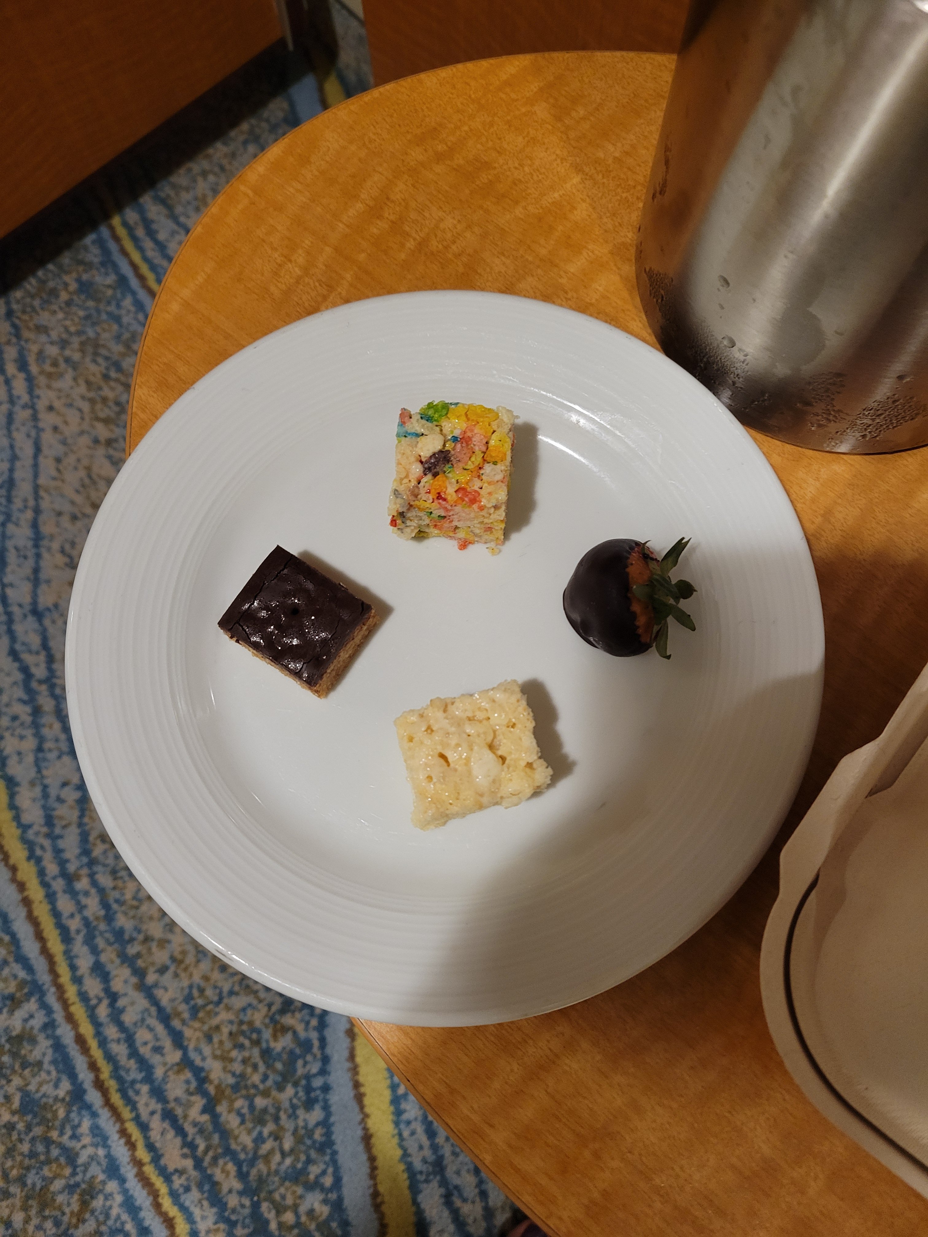 @WAYNO and I met in the casino. He too is feeling the uncouth. But he is also braving the WJ. Today is a partial sea day basically because we get to port later. I went to the casino and won a little and lost a lot......at least for me . After getting my card situated at guest services we got a mystery charge. They said we didn't pay our balance from last cruise . But also we did because there is no balance. They are now working on the charge and will update us later. Also I wanted to take a photo but didn't.......the pools are filthy and full. I'm in a bubble. CL, casino (deck 4)CP, and my room. When I leave the bubble people are cuckoo bananas. I like morning room services. With my leakproof Ello bottle I can keep the ice I get cold and I can return to the room at any time without worry. They hung new art. It's very much on trend and people are flocking to buy some. We got our chef's treats. It was confirmed that the cards we got are the new cards going forward.10 points