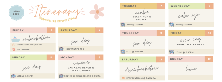 I wasn't going to start a cruise blog yet, and I actually just commented that I wasn't. Then I saw plenty of other posters starting their blog a month before their sailing. So I'm going for it! My (36) name is Natalie and I am a first-time cruiser (not counting the cruise I went on as a child with Disney). My (12-year-old) daughter and I are sailing on Adventure of the Seas on October 3rd. I booked this October 5th of 2024...so the wait has been torture, but planning has been half the fun. Itinerary is as follows: I love to make graphics so you might see a couple here. I'm extra, and I own it. I won't even embarass myself and show you my actual detailed itinerary and packing list (complete with photos of each item haha). I am very type A when planning, and what I like to call type C when I actually get somewhere. I am basically a vacation over-planner who never follows the plan to a T, but still knows the best restaurants and everything going on within a 2-mile radius at all times. We might not attend what I planned...but if you ever ask "what can we do next" I will have a list of multiple options. We live in Kentucky and will be driving because I could not find flights/hotel that were as affordable as driving down. Cheapest I could find was $903 and honestly the times for return flight are cutting it a little close on that one so makes me nervous. I doubt anything will change price wise but we are open to flying of course if it can be cheaper than driving. We are leaving October 2nd bright and early and driving all day. We will be staying in a hotel about 3 hours from Port Canaveral. Our boarding time is 12:30-1pm. I know that it is suggested to have less of a travel time to port on departure day but this is what works for us, and I believe it will be all ok. I can’t get off work an extra day as I have accruing PTO and I’ve already drained everything I’ve saved for taking off the 2nd until the 13th. Right now I am just purchasing a few last minute items over the next few weeks but everything is booked, and my sinking fund is almost capped to my goal. So feeling really good to go! I was able to pay off the cruise early, and as someone who strictly budgets...it's felt really good to work hard and pay cash for everything. I am currently getting my MPH and while my work pays for it, I have to pay taxes on everything over $5,025. So it's been a pretty big cut to my budget BUT I picked up a second job to help and the cash has been nice! I'm sure that is a lot of unnecessary info but I'm an oversharer. 22 days and 17 hours until cruise time! We have never been to any of these places, and I am so excited to show my daughter locations she has never seen. I did get the internet package so should be posting as I sail. We started with a smaller ship and hope to upgrade each booking as wel go along. I have refrained from booking a second cruise until I know we both love it...but I'm itching already and haven't even gone haha. Thanks for following along if you choose to do so!10 points