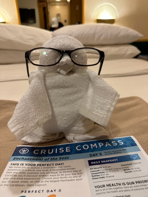 She Sails Away Posted January 31, 2023 Author Report Posted January 31, 2023 Today was a mixed day. Started off great. I had a lovely breakfast in the main dining room, and then I went to the communal puzzle table and worked on a puzzle for a while, which probably sounds like the most idiotic thing possible to do on a cruise ship, but I loved it. And as a sidenote, the little puzzle library here has six puzzles and between all the passengers on the ship all six have already been smoked through. A nice lady joined me and we worked a long time. We docked at Coco cay. Oasis of the seas is here and she got here about an hour ahead of us so by the time our gangplank went down, thousands upon thousands of people had already flowed out of Oasis and filled up the beaches. I'm sure that wrecked some plans for a few people but it didn't bother me as I did not intend to go outside today. I lounged around all morning and enjoyed being lazy. I went up to the spa when they were giving out complimentary massage tasters and no surprise, ended up booking a massage for the afternoon. Most everybody was off the ship today, because when I went to name that tune, there were four tables total playing the game. To my horror, Martha was there. I avoided eye contact and hoped she would not decide to join me and maybe get the other two tables to join us so we were all just one big team that wins by default. But she didn't, so that was good. Name that tune was fun… The theme for the day was classic rock. I won a nifty Royal Caribbean clippy thing. Later I made myself get off the ship to just get a few photos of both of the ships side-by-side. When I came back, my heart started pounding really hard to the point where my watch sent me a little alarm. It was at 107 and it stayed at about 94 for a couple of hours. it was not pleasant and I was trying hard not to panic. But it did not feel good. It doesn't happen to me often but when it does it's usually from hypoglycemia or from being dehydrated. I really think I was just dehydrated so I started pounding water. I had an acupuncture appointment at four so I made sure to tell the doctor all about it. The acupuncture session went terrific and by the time I left my heart was nice and quiet and beating normally again. today I told the acupuncturist that my mom is not in good health and we believe she may have lung cancer. We are waiting for her to be scheduled for a biopsy but it's not looking good. She had breast cancer five years ago and this is most likely a reoccurrence. Of course I scheduled this cruise months before any of this happened and I almost didn't even come, but she's not gonna have a biopsy till I get back and my sister is with her right now so everyone encouraged me to come. My dad told me to take a break and enjoy it because they will need me when I get back. Anyway. We talked about that for quite a while and I talked about her symptoms that she's had and one of the worst ones is fluid retention. She's on a strong diuretic and heart medication and all kinds of things. He showed me an acupressure point that I could use on her twice a day and he says it will help with her fluid retention in her lungs. I'm definitely going to give it a try. The acupuncturist is great… Not that I have any frame of reference, as I've never tried it before. I have a health condition of my own that is getting out of hand and I wanted some symptom relief since my specialist can't do much for it. And it really has helped. Immediately after my acupuncture, I had a perfect day at Cococay massage special. It's a really long massage with a mini facial at the end. They normally do Swedish massage but that always makes me sick, so I asked for a hot stone instead and they let me have it for just a little bit extra. My massage therapist was terrific and I made another appointment with her for tommorow. I didn't get out till after seven so then it was a dash to Windjammer where I loaded up and then had Ben & Jerry's afterwards. Surprisingly there's not much going on tonight. I think they want everybody to end up in the casino. Last night there was quite a bit going on, one event after the other, designed to keep everybody up till midnight. Not so much tonight. There were two Princess ships anchored by their little teeny tiny island next to ours and it was really a lovely day. Lots of people utilizing the sundeck and pool today as well. The app had several little mistakes in it today, nothing to get excited about, but several things were off. oh! Exciting news… Today the sewage smell in my bathroom went away. It did resurface in a big way in a random pocket of the ship near the dining room and the Schooner bar. Going to call it a night pretty soon. Sneak peek at tomorrow's menu (Italian Night) and a few photos. IRMO12HD, JohnK6404, KristiZ and 5 others 8 Quote