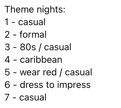 DoomSlayer Posted November 20, 2024 Author Report Posted November 20, 2024 12 minutes ago, smokeybandit said: I thought Red Night was a night club activity and nothing to do with dining. Could be, it was just something mentioned in the Facebook group specific for the Christmas cruise. Supposedly this person asked Royal about the theme nights for the trip and Royal responded with below image (they only posted an image of the response). I am just trying to figure out if it is a true theme, or just for the club. My wife likes to dress up for theme nights, so just trying to figure it out before she decides she needs a new dress or something. Quote