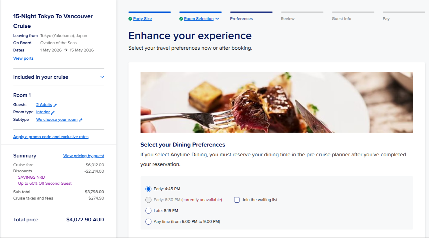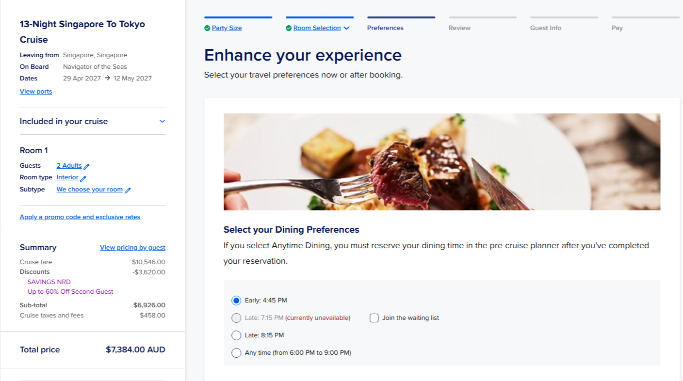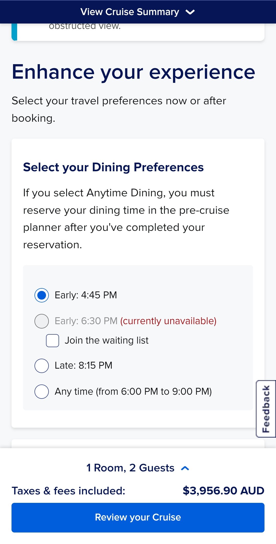 Jamesszy94 Posted February 2 Author Report Posted February 2 I did a mock booking for a different Ovation sailing out of Los Angeles, and the 4:45pm dinner was gone. Did another Ovation sailing for a different cruise out of Singapore and 4:45 is back.... I tried Navigator sailing out of Singapore and looks like it is also offering 4:45pm dinner times. So far all sailings I've checked out of Asia seem like they're offering 4:45pm dinner. So it probably is just a geographical thing. RCIfan1912 1 Quote