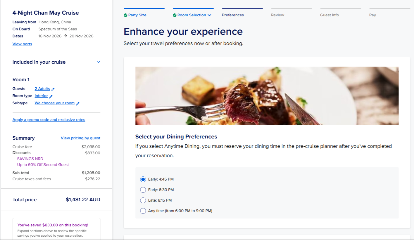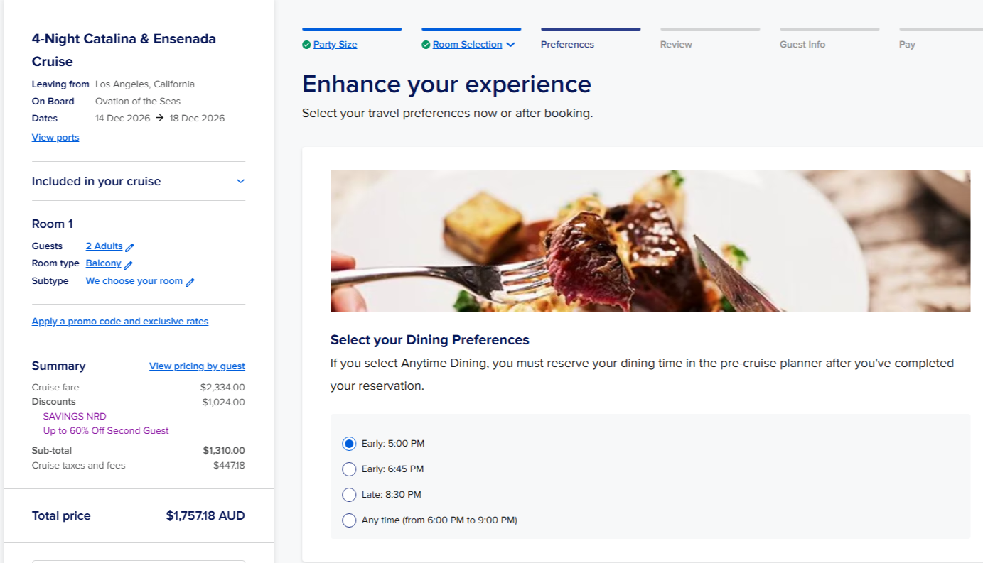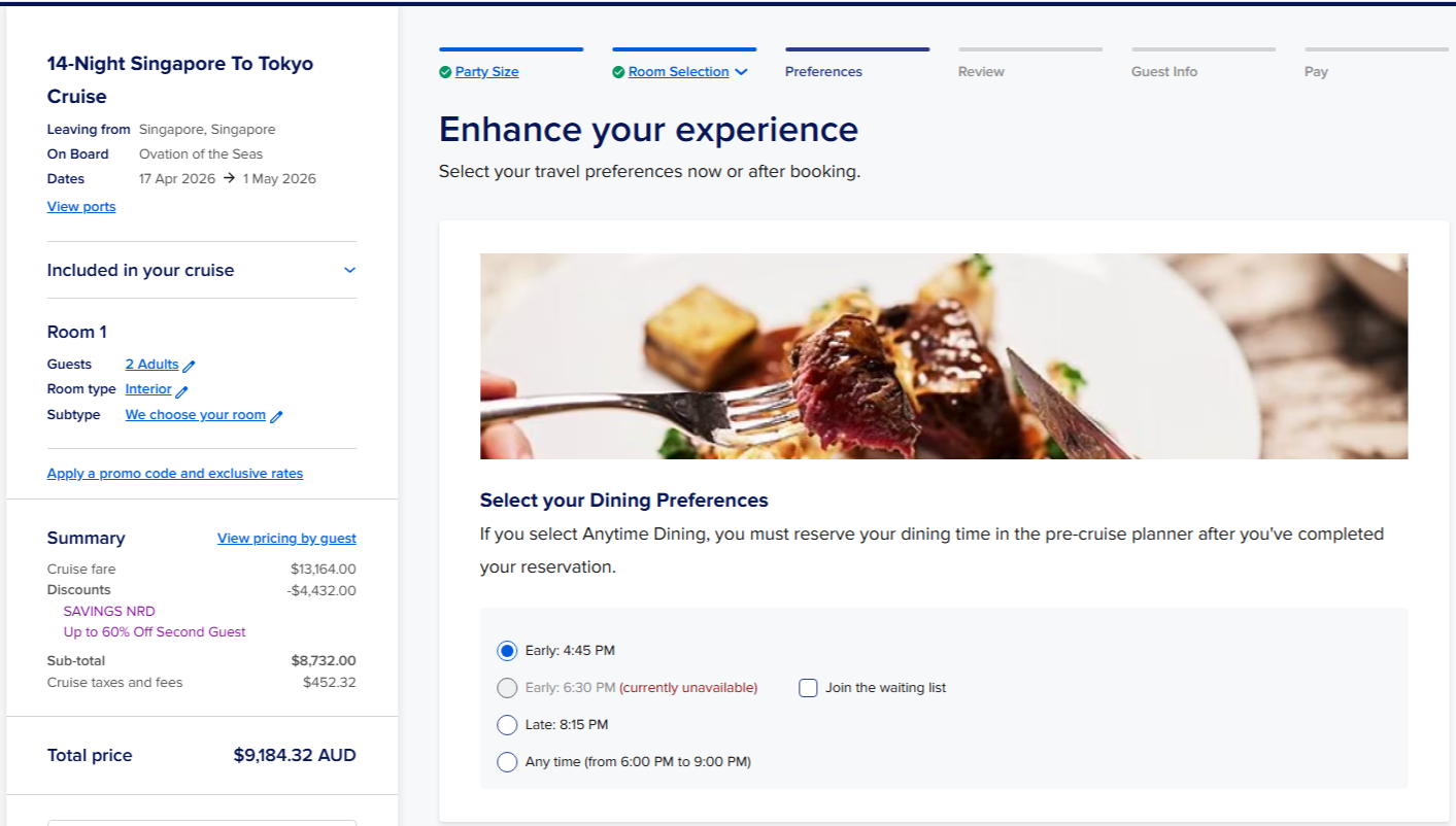 Jamesszy94 Posted February 2 Author Report Posted February 2 I did a mock booking for a different Ovation sailing out of Los Angeles, and the 4:45pm dinner was gone. Did another Ovation sailing for a different cruise out of Singapore and 4:45 is back.... I tried Navigator sailing out of Singapore and looks like it is also offering 4:45pm dinner times. So far all sailings I've checked out of Asia seem like they're offering 4:45pm dinner. So it probably is just a geographical thing. RCIfan1912 1 Quote