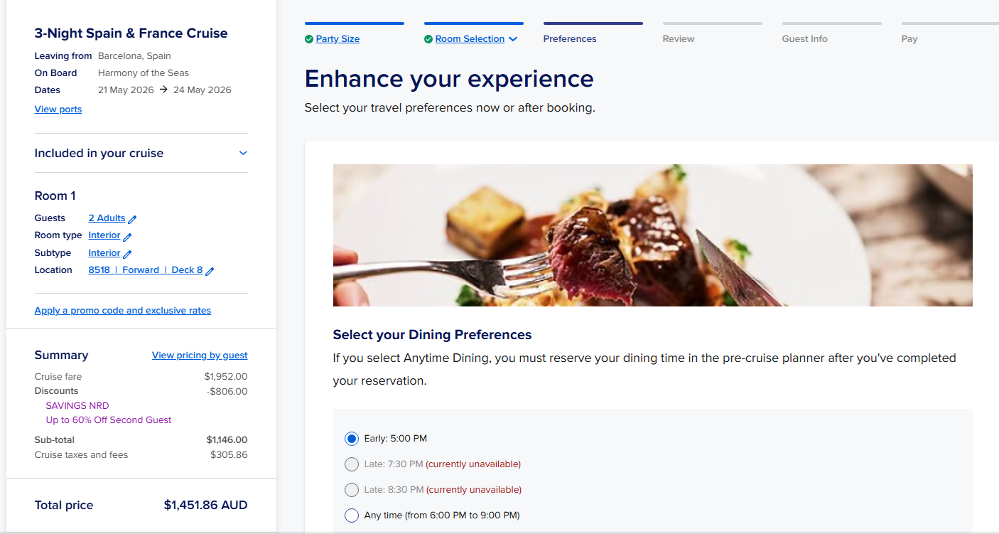 Doug_Texas Posted February 2 Report Posted February 2 On 2/1/2026 at 8:28 AM, WannaCruise said: OP what ship is this? We are traditional dining time fans. We typically eat 6pm at home so we used to book 5:30pm all the time. Then the 5:30pm times got moved back to 5pm. Still early and what I hate most is that it means your afternoon ends 3:45pm-4pm so that we can go back and shower. We still managed though. But 4:45pm? That's getting ridiculous. Last March on Freedom we had 5pm booked but when we got there, they assigned us 6:45pm time. This time was perfect! Not too early. Not too late. This past December on Harmony, we tried 7:30pm. We weren't sure if it would be too late, but we ended up loving it and now want to change our outstanding cruises that have early dining booked to this time. The only exception is our upcoming March cruise on Oasis. We have 5pm dinner time (it was 5:30pm when we booked the cruise). The issues it that shows came out early to reserve so we can't move our time now since shows are booked around dinner times. Hope 4:45pm isn't the new norm. We're with you 100% We also used to book 5:30. The good thing about Royal is they are communicating clearly what the times are and allow you to select. We’ve been pushed into “My Time” which works well enough but my only complaint is when you are trying to book a cruise with “My Time” and are told “My Time” is full and unavailable. WannaCruise 1 Quote